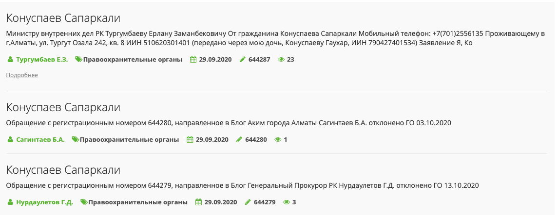 29 сентября отец погибшего направил три обращения на сайте «Открытый диалог» — министру внутренних дел Тургумбаеву, акиму Алматы Сагинтаеву и генеральному прокурору Нурдаулетову. Два обращения — акиму и Генпрокурору — были отклонены, а глава министерства внутренних дел в ответе на обращение принес соболезнования семье Конуспаевых и сообщил, что уголовное дело о халатности находится в производстве следователя Антикоррупционной службы по Алматы Василевского.