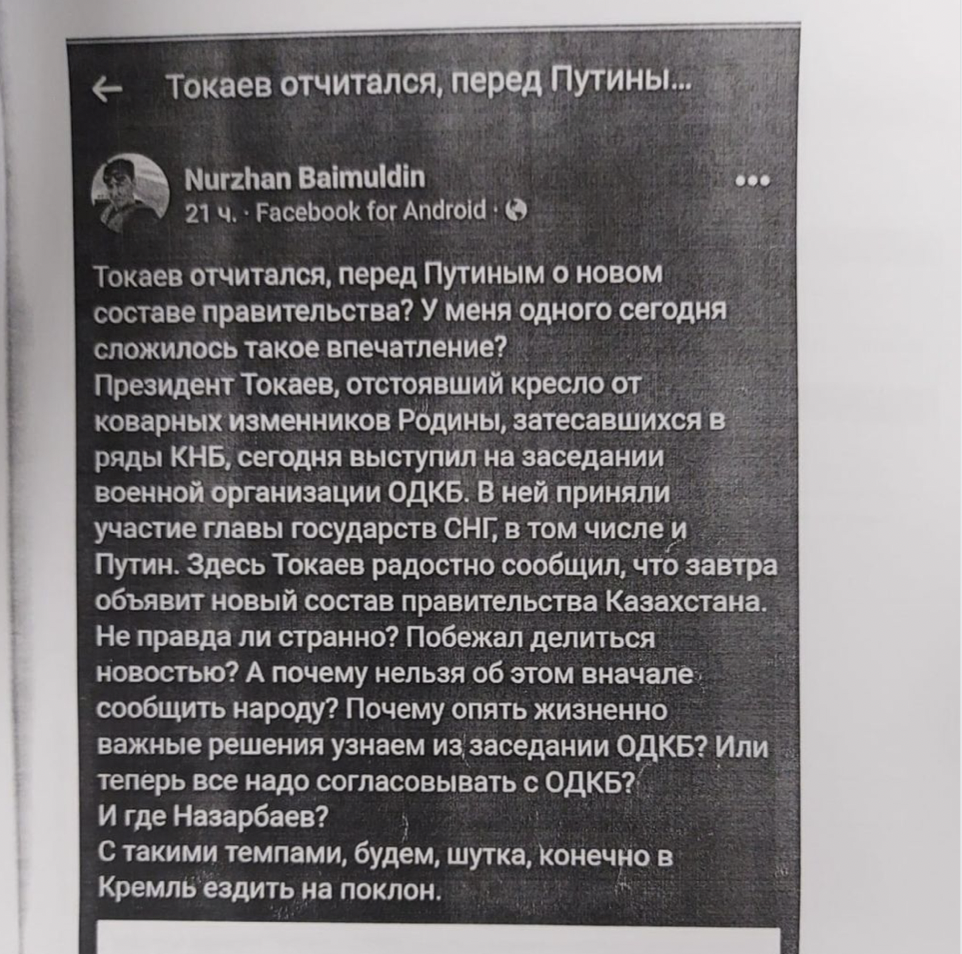 10 января после заседания членов ОДКБ журналист опубликовал в фейсбуке пост, в котором написал: «Токаев отчитался перед Путиным о новом составе правительства? У меня одного сегодня сложилось такое впечатление?». На допросе следователь спрашивал у Баймулдина, что тот «имел в виду, публикуя эти слова».